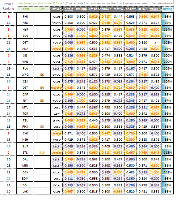 Using the final overall rating in combination with the line value analysis, the database offers betting recommendations in dollar amounts ranging from $1 to about $25 (which you can scale to your own betting range). The idea is to always bet where there is value, but to bet more where value comes with a recipe for winning (and also to bet more where there is more value)!