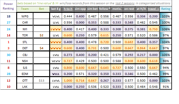 Using the final overall rating in combination with the line value analysis, the database offers betting recommendations in dollar amounts ranging from $1 to about $25 (which you can scale to your own betting range). The idea is to always bet where there is value, but to bet more where value comes with a recipe for winning (and also to bet more where there is more value)!