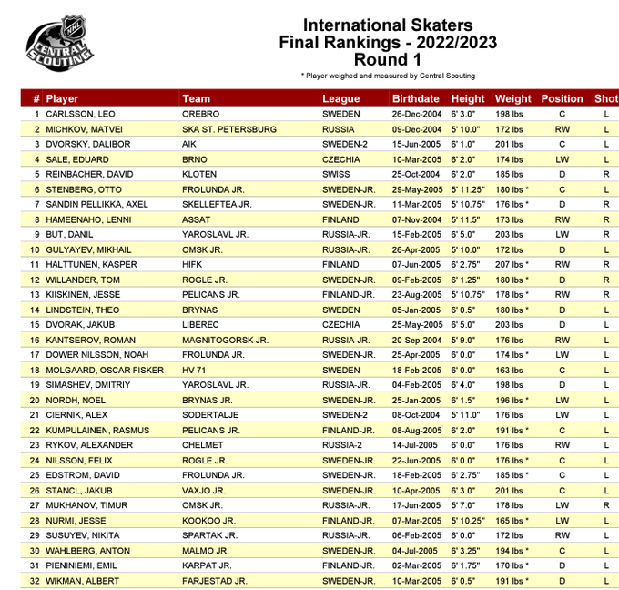 Top 32 international skaters according to NHL Central Scouting. #NHLDraft