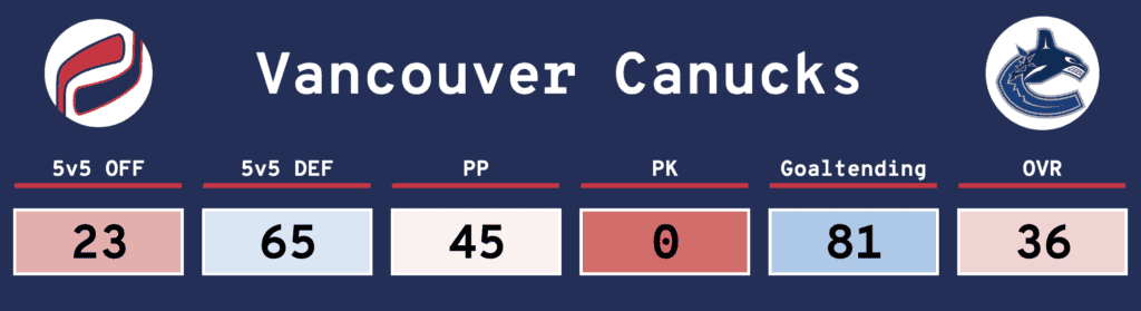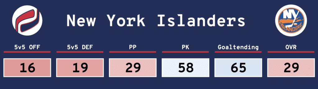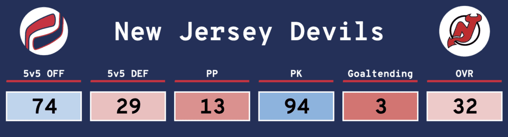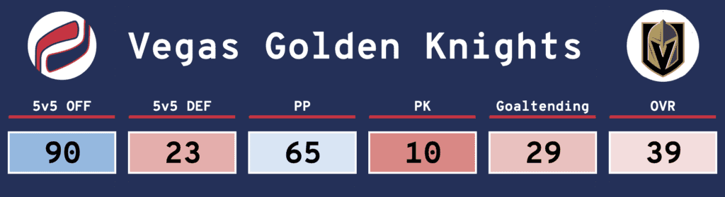 Welcome to the Daily Faceoff midseason report cards. Here, we’re going to be using some analytics to find out which teams are struggling and who is at the top of the class. Teams are graded on how they stack up against league average in a variety of key metrics both offensively and defensively. The best team is given a score of 100 and the worst is given 0. To determine team OVR, all five metrics (5v5 OFF, 5v5 DEF, PP, PK and Goaltending) are combined.