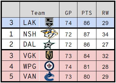 The Los Angeles Kings, Nashville Predators, Dallas Stars, Vegas Golden Knights, and Vancouver Canucks are all in action on Tuesday night with a multitude of playoff implications on the line. Most notably, the Golden Knights will face off against the Canucks. A Canucks loss will ostensibly eliminate them from the playoff race whereas a win will not only put them in contention for a Wild Card spot but also put them within reaching distance of the Kings for third place in the Pacific Division.