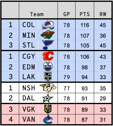 — NHL (@NHL) April 23, 2022The Avalance have not been their usual dominant selves lately and, for the first time in what seems like an eternity, to not appear as though they will win the Presidents Trophy. The Avalanche will likely finish runner-ups to the Florida Panthers as they have two more points and have played one fewer game. The Avalanche are now on a three-game losing streak (0-3-0) for the first time since the opening week of the season. Darcy Kuemper (G) has also come back down to earth with a .873 SV% in his last four games (2-2-0) after posting a gaudy .956 SV% in his previous 10 (7-2-1).