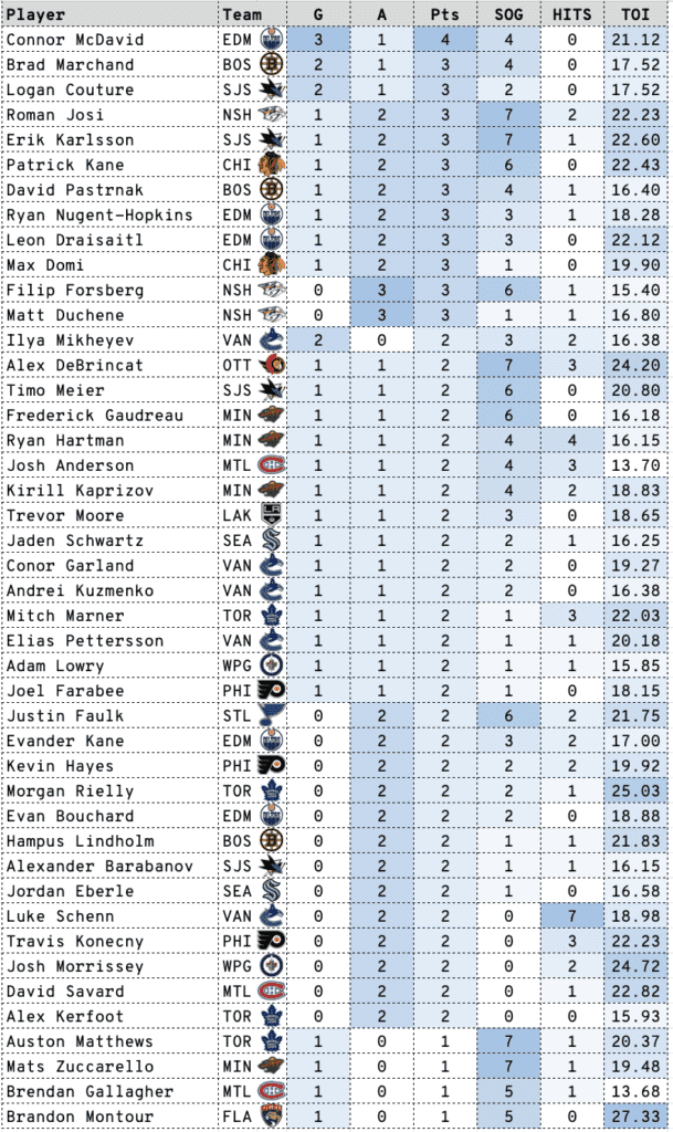 — Brady Trettenero (@BradyTrett) October 28, 2022Leon Draisaitl tied McDavid for the league lead as his goal (4) and two assists also brought him to 15 points (4G/11A). In the win, Ryan Nugent-Hopkins joined in on the fun with a three-point (1G/2A) performance. Nugent-Hopkins now has 11 points (5G/6A) in his last six games. Evander Kane and Evan Bouchard each picked up a pair of assists, and five Oilers ended the game with multiple points. Jack Campbell struggled despite moving to 4-2-0 on the season, as he allowed five goals on 36 shots (.861 SV%) for his third win in his last four games. Alex Stalock finally came down to earth after winning his last three starts, allowing six goals on 38 shots (.842 SV%) and nearly doubling his goals against the year (13 GA). Patrick Kane ascended above a point-per-game with a goal (2) and two assists bringing him to eight points (2G/5A) in seven games. Max Domi also continued his resurgent season, scoring his fourth goal and adding two assists to get to seven points (4G/3A) in seven games since joining the Blackhawks.