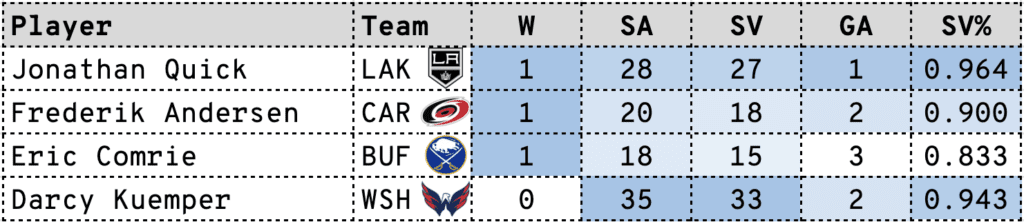Jonathan Quick had his best start of the season Monday as he stopped 27 of 28 shots (.964 SV%) to lead the 6-5-0 Kings to their second win in a row. Gabe Vilardi continued his scorching start to the season as he picked up a goal (8) and an assist to bring his team lead in points to 13 (8G/5A) in 11 games.