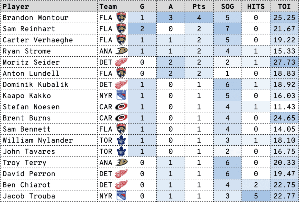 Brandon Montour continued to fill in admirably for the injured Aaron Ekblad as he grabbed a goal (4) and three assists to bring his season totals to an impressive 12 points (4G/8A) in 10 games. Carter Verhaeghe stayed red-hot with a goal and an assist, giving up 11 points (6G/5A) in his last seven games. Anton Lundell moved up the lineup to play with Reinhart and had two assists, giving him seven points (1G/6A) in his last eight games. John Gibson was under constant pressure, facing 40-plus shots for the fourth time in 10 games. He allowed four goals on 47 shots (.915 SV%) for his league-high seventh loss of the season. Ryan Strome was the lone Ducks standout, as he had a goal (4) and an assist to bring him to 10 points (4G/6A) in his first 12 games since joining Anaheim in the offseason.