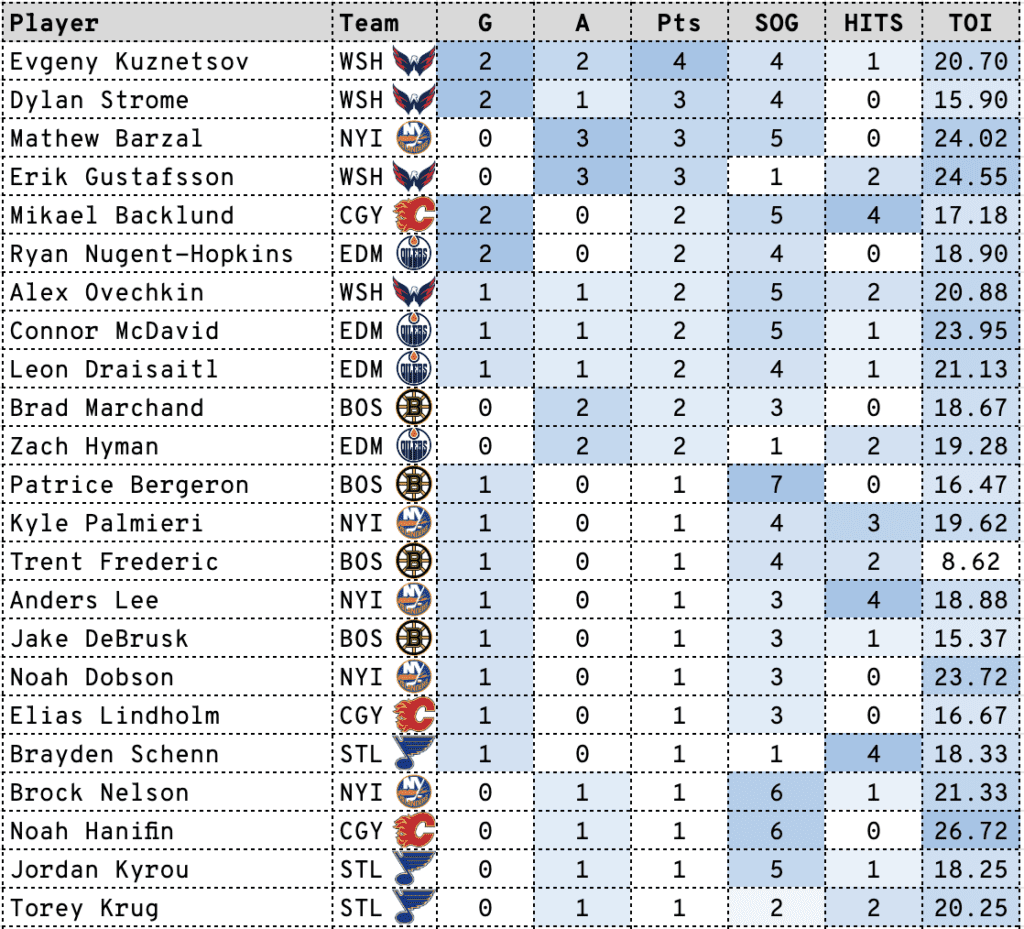 It took 13 games, but Evgeny Kuznetsov finally scored Monday, leading all skaters with four points (2G/2A) as Washington beat Edmonton 5-4 at home.