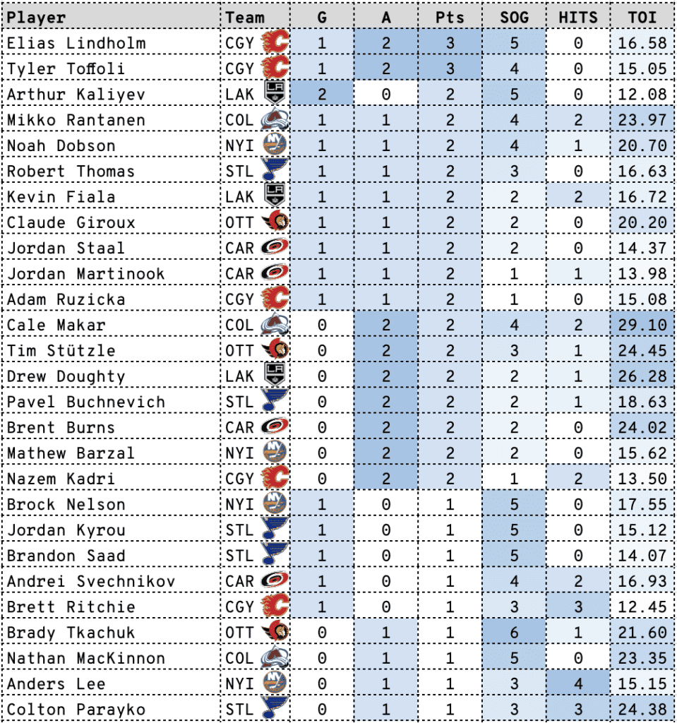 Jordan Binnington had his best start of the season Monday, stopping 45 of 47 shots (.957 SV%) in his third straight victory (6-5-0) as he led St. Louis over the Avalanche 3-2. The league’s lowest-scoring team, the Blues spread out their goals with markers from Robert Thomas (3), Brandon Saad (3) and Jordan Kyrou (3), while Pavel Buchnevich continued to prove impactful when healthy, picking up two assists to move to six points (1G/5A) in nine games. Alexandar Georgiev took his first loss in four starts to move to 7-2-1 after allowing three goals on 39 shots (.923 SV%). Mikko Rantanen extended his torrid run of late and current point streak to six games (8G/8A) with a goal and an assist, as he now ranks third in the NHL in points with 25 (11G/14A). Cale Makar moved to third in points among all defensemen with two assists on the night, bringing him to 18 points (3G/15A) in 14 games as he continues his run for back-to-back Norris Trophies.