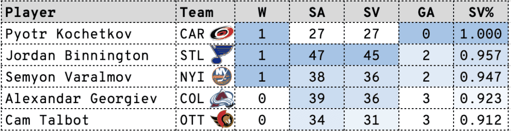 Pyotr Kochetkov continued to make a strong early impression filling in for an injured Frederik Andersen, stopping all 27 shots for his first career shutout (2-0-0) as Carolina won 3-0 in Chicago. The Hurricanes’ third line carried them to victory, with Jordan Martinook and Jordan Staal cashing in with one goal and one assist in the first period.