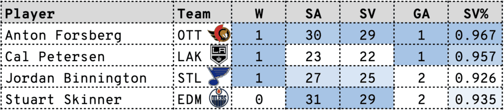 — NHL (@NHL) November 17, 2022Cal Petersen had his best start of the season, stopping 22 of 23 shots (.957 SV%) as he held NHL points leader Connor McDavid pointless for the first time in ten games and Leon Draisaitl without a point for the first time in 11 games. Viktor Arvidsson picked up an assist on all three Kings’ goals (8,9,10) and now has 13 points (3G/10A) in his last 12 games. Stuart Skinner was the unfortunate loser after allowing only two goals on 31 shots (.935 SV%) as he continued to impress but moved to 3-4-0 with the losing effort.