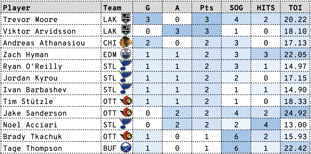 Trevor Moore had a night to remember as he scored all three of the Kings’ goals (3,4,5) for his first career hat-trick as Los Angeles won 3-1 in Edmonton.