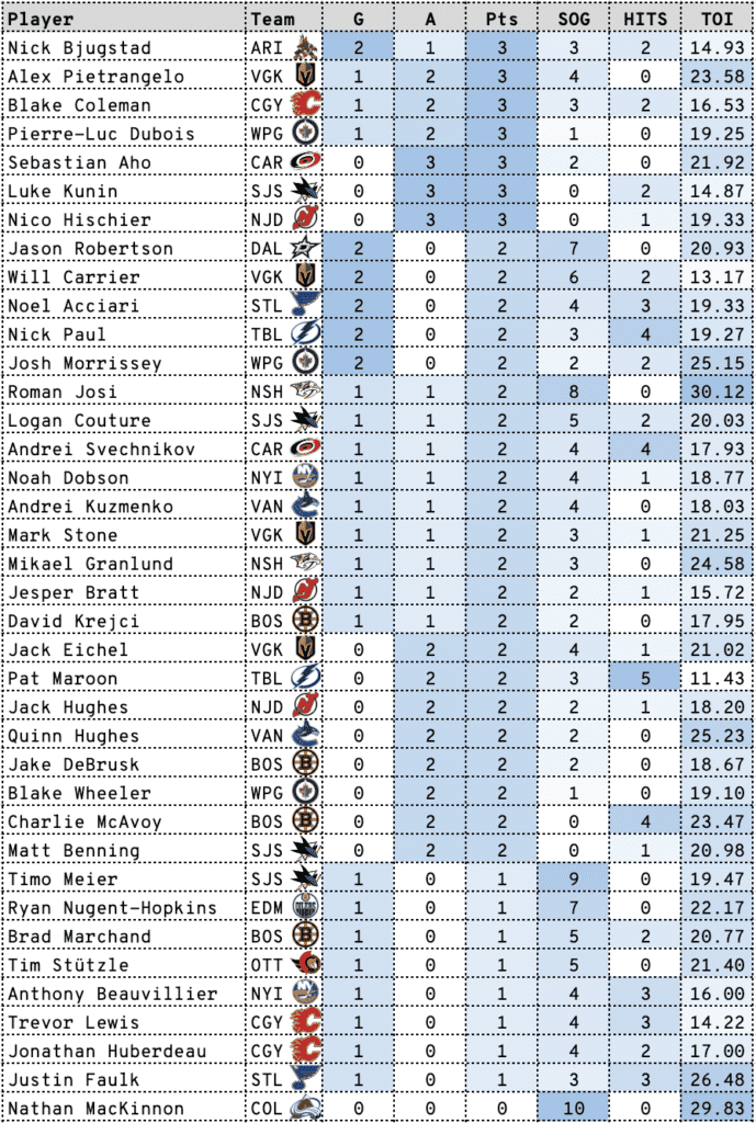 Cale Makar historically scored (5) ten minutes into the first period to become the fastest defenseman in NHL history to reach 200 points (195 GP) as Colorado beat Dallas 3-2 in a shootout. Alexandar Georgiev continued his incredible start to his Avalanche tenure, stopping 22 of 24 shots (.917 SV%) to pick up his fifth win in six starts and move to a 9-2-1 record. Alex Newhook (4) scored the other Colorado goal, as he now has points in three straight games (2G/1A). Jake Oettinger was incredible yet again, as he was the unfortunate loser after allowing just two goals on 35 shots (.943 SV%) to move 7-2-2 on the year. Jason Robertson accounted for the entire Dallas offence as he scored both goals (13,14) and added a game-high seven SOG as he now ranks third in the NHL in points with 29 (14G/15A) through 19 games.