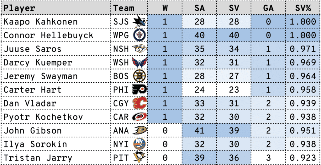Kaapo Kahkonen was perfect in his best start of the season, stopping 28 of 28 shots to move to 3-5-2 as San Jose beat Montreal 4-0 off three third-period goals Tuesday. Tomas Hertl scored two goals (6,7) off a game-high six SOG as he now has nine points (3G/6A) in his last eight contests. Logan Couture also stayed scorching hot with his goal (13) and assist (9) as the centre now has 14 points (9G/5A) in his last 11 games, while Kevin Lebanc also had a multi-point performance with a pair of assists (8,9) off only 13:13 TOI. Unfortunately, Jake Allen’s struggles continued as the 32-year-old allowed three goals on 23 shots (.8770 SV%) with no offensive help to pick up his third loss in four starts and move to 6-8-0 on the season.