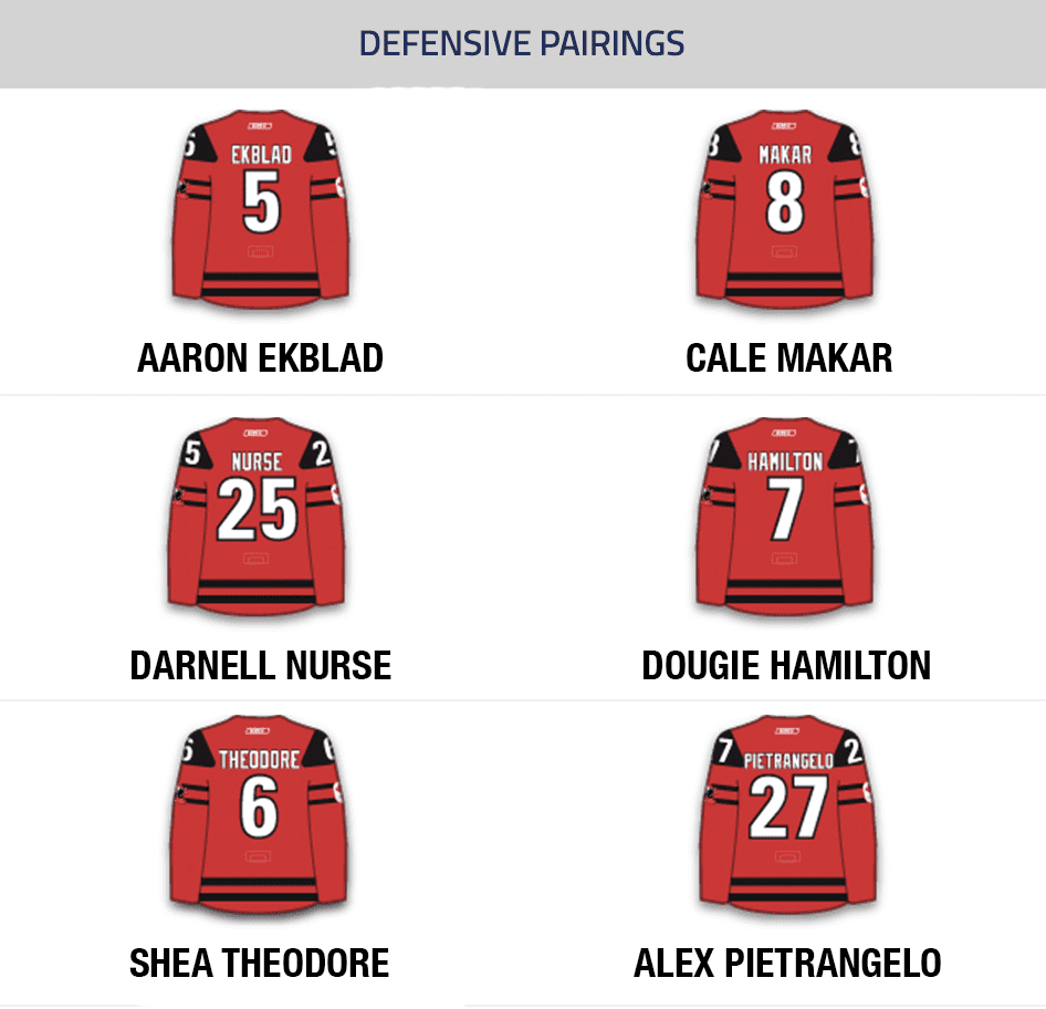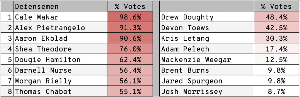 There was a little more debate about which defensemen should be on the team. The locks were Cale Makar, Alex Pietrangelo and Aaron Ekblad. 11 players received at least 30 percent of the vote, with Shea Theodore, Dougie Hamilton, Darnell Nurse, Morgan Rielly and Thomas Chabot rounding out the group.
