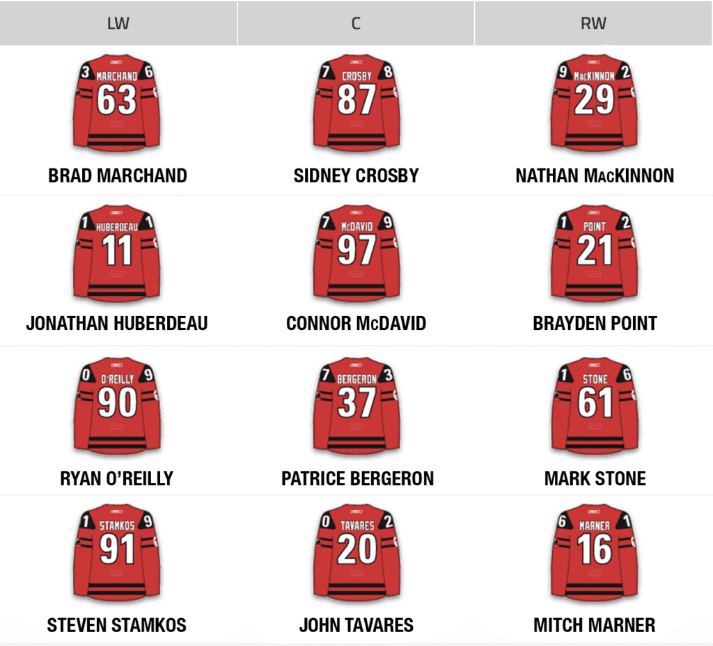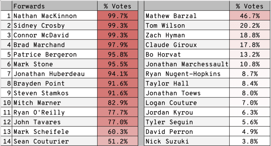 Unsurprisingly, your locks were Nathan MacKinnon, Sidney Crosby, Connor McDavid, Brad Marchand, Patrice Bergeron, Mark Stone and Jonathan Huberdeau. Players like Brayden Point, Steven Stamkos, Mitch Marner, Ryan O’Reilly and John Tavares comfortably made the roster, getting at least 77 percent of the votes–but there was at least some question whether they should be on the team.