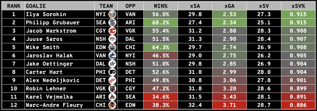 Each day, we will rank the day’s starting goalies based on their Projected Win%, Goals Against Average, and SV%. Win percentage and expected goals against is generated from Sportsbooks Odds and Implied Totals.