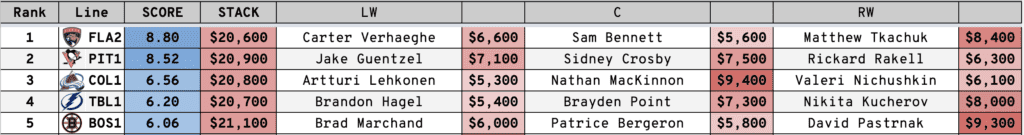 | Lehkonen – MacKinnon – Nichushkin Rodrigues – Compher – Rantanen Cogliano – Newhook – O’Connor Nieto – Meyers – Malgin ——————————————————— Girard – Toews Byram – Englund Hunt – MacDermid | Hagel – Point – Kucherov Cirelli – Stamkos – Killorn Colton – Paul – Maroon Namestnikov – Bellemare – Perry ——————————————————— Hedman – Bogosian Sergachev – Cernak Perbix – Cole |