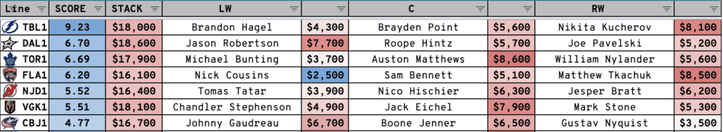 | Gaudreau ⚠️ – Jenner – Nyquist Chinakhov – Sillinger – Meyer Johnson – Roslovic – Fix-Wolansky Robinson – Kuraly – Olivier Gavrikov – Bjork Christiansen – Gudbranson ⚠️ Bayreuther – Peeke | Stephenson – Eichel – Stone Marchessault – Karlsson – Smith Cotter – Roy – Kessel Carrier – Leschyshyn – Kolesar Martinez – Pietrangelo McNabb – Theodore Hague – Whitecloud |