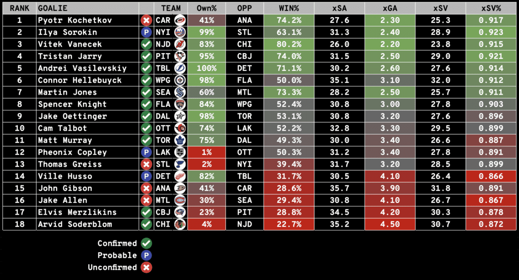 The Notebook includes everything you need to know to set your Season-Long and Daily Fantasy Lineups: including Injuries, Projected Lines and Pairings, Starting Goalie Rankings, and Value Picks (DFS).