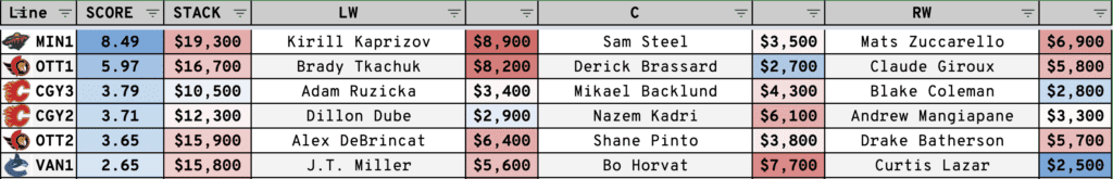 | Huberdeau – Lindholm – Toffoli Dube – Kadri – Mangiapane Ruzicka – Backlund – Coleman Lewis – Zohorna – Ritchie Hanifin – Andersson Zadorov – Weegar Mackey – Stone | Miller – Horvat – Lazar Mikheyev – Pettersson – Kuzmenko Garland – Dries – Boeser Joshua – Aman – Studnicka Ekman-Larsson – Bear Hughes – Schenn Burroughs – Myers |