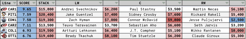 | Svechnikov – Statsny – Necas Teravainen – Aho – Jarvis Martinook – Staal – Fast Noesen – Kotkaniemi – Stepan Slavin – Burns Skjei – Pesce De Haan – Chatfield | Johnson – Domi – Kane Kurashev – Toews – Raddysh Athanasiou – Dickinson – Lafferty Katchouk – Johnson – Entwistle McCabe – Jones Phillips – Muphy Johnson – Jones |