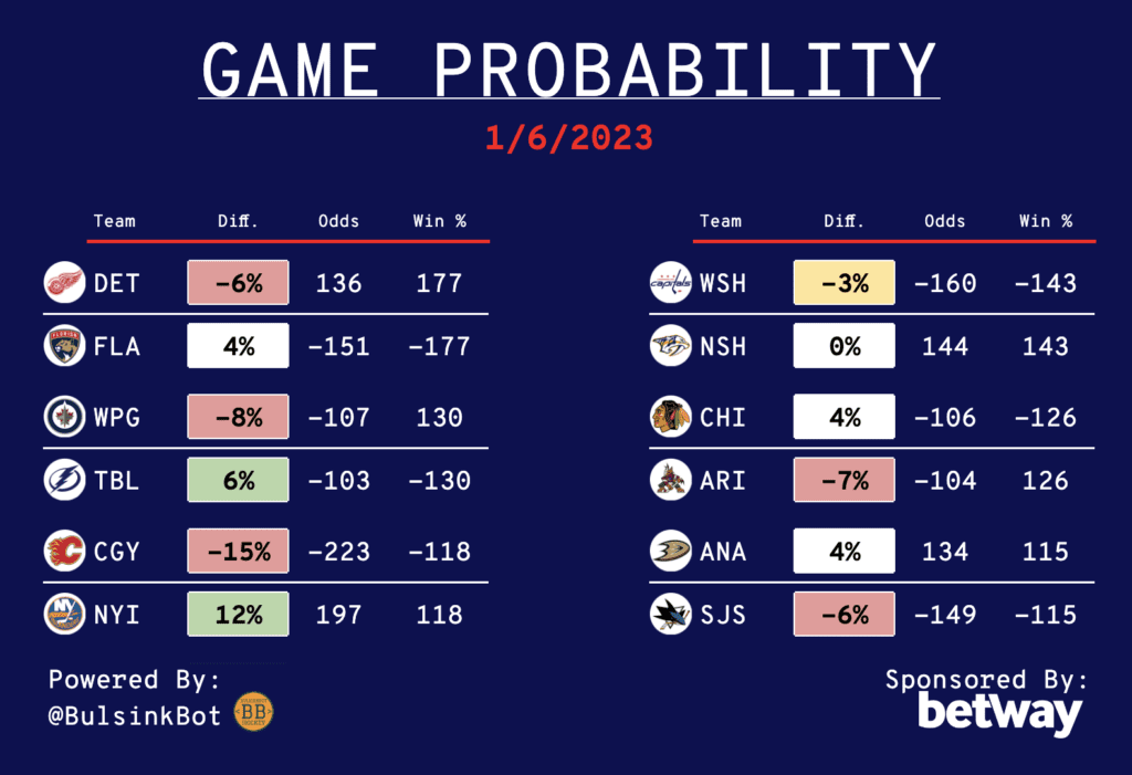 Each day we will look at each game, the Sportsbook Odds (via Betway), and the odds of each team winning based on the model created by Philip Bulsink. Based on those two numbers, we can quickly identify which teams we need to bet on, which teams to avoid and which lines to keep an eye on throughout the day.