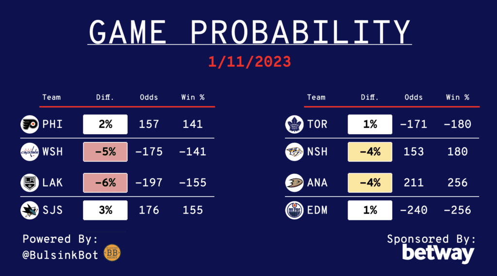 Each day we will look at each game, the Sportsbook Odds (via Betway), and the odds of each team winning based on the model created by Philip Bulsink. Based on those two numbers, we can quickly identify which teams we need to bet on, which teams to avoid and which lines to keep an eye on throughout the day.