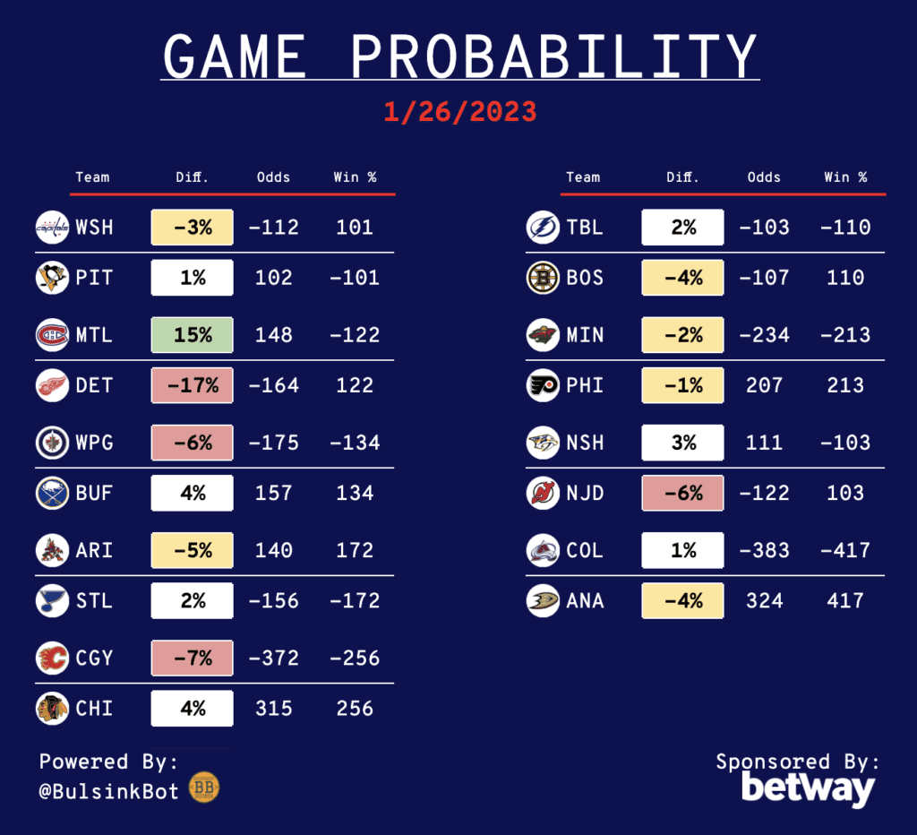 Each day we will look at each game, the Sportsbook Odds (via Betway), and the odds of each team winning based on the model created by Philip Bulsink. Based on those two numbers, we can quickly identify which teams we need to bet on, which teams to avoid and which lines to keep an eye on throughout the day.