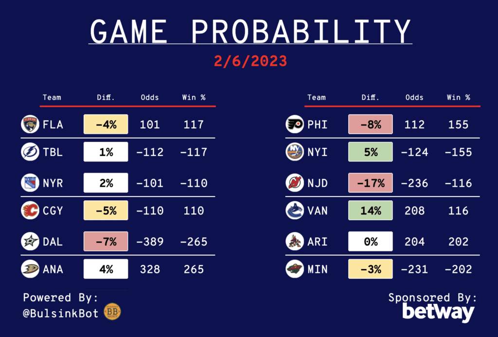 Each day we will look at each game, the Sportsbook Odds (via Betway), and the odds of each team winning based on the model created by Philip Bulsink. Based on those two numbers, we can quickly identify which teams we need to bet on, which teams to avoid and which lines to keep an eye on throughout the day.