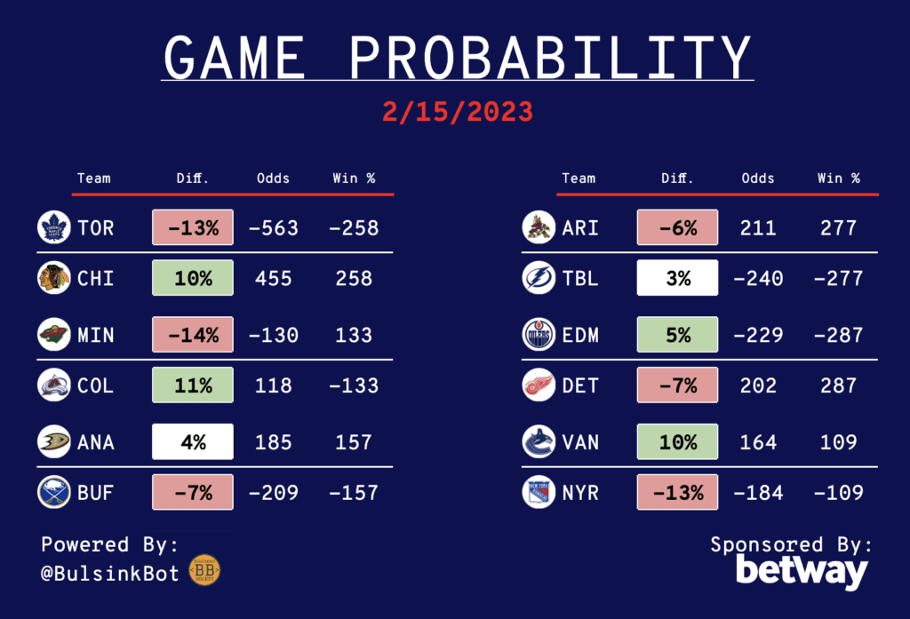 Each day we will look at each game, the Sportsbook Odds (via Betway), and the odds of each team winning based on the model created by Philip Bulsink. Based on those two numbers, we can quickly identify which teams we need to bet on, which teams to avoid and which lines to keep an eye on throughout the day.