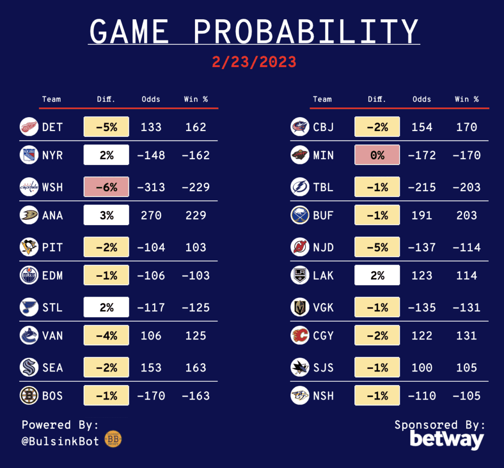 I’ve never seen anything like this. I didn’t post the betting guide on Wednesday because the model was in-line with the sportsbooks, and did not see any value on the board. That’s normal for a three-game slate, but no bets on a 10-game slate!? Unheard of. The one lean that the model has, which has gotten stronger in the last hour, is Anaheim @ Washington. The Capitals will get Alex Ovechkin (personal) back tonight but will be without Anthony Mantha (injured reserve), Dmitry Orlov and Garnet Hathaway, who was scratched for trade-related reasons. It’s not fully there, so feel free to pass because it’s admittedly a bit thin. However, I couldn’t go two full days with NO BETS! Half a unit at most.