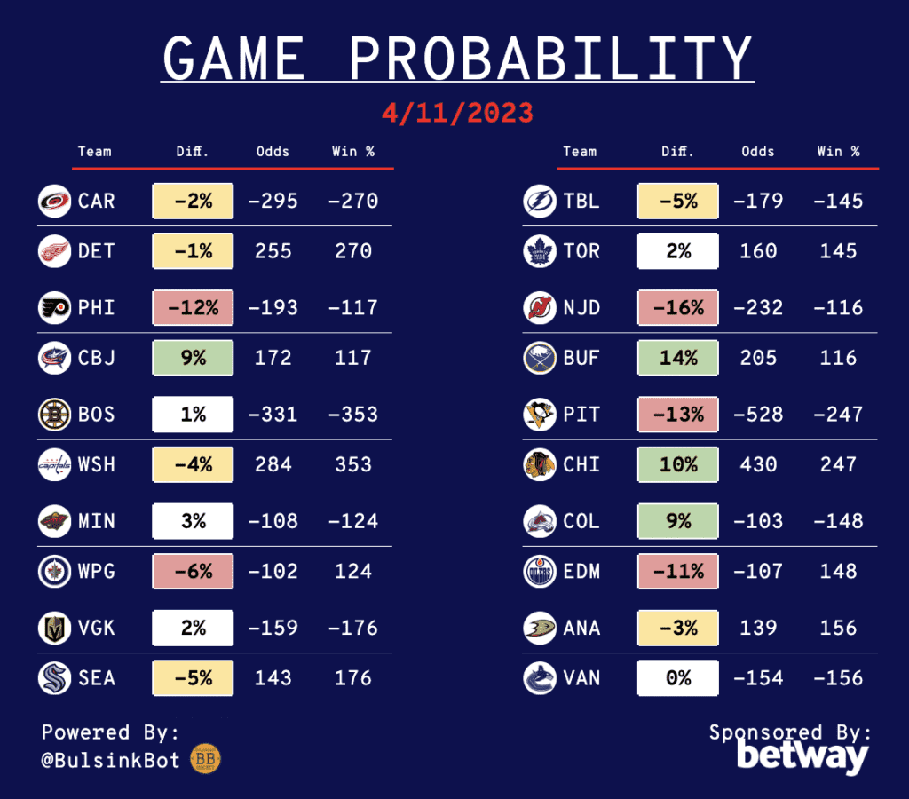 Each day we will look at each game, the Sportsbook Odds (via Betway), and the odds of each team winning based on the model created by Philip Bulsink. Based on those two numbers, we can quickly identify which teams we need to bet on, which teams to avoid and which lines to keep an eye on throughout the day.