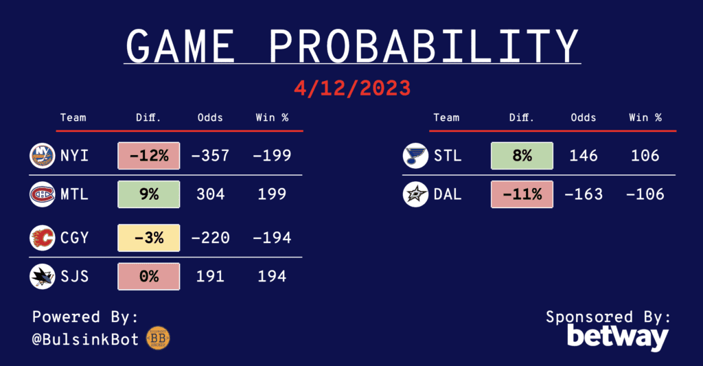 Each day we will look at each game, the Sportsbook Odds (via Betway), and the odds of each team winning based on the model created by Philip Bulsink. Based on those two numbers, we can quickly identify which teams we need to bet on, which teams to avoid and which lines to keep an eye on throughout the day.