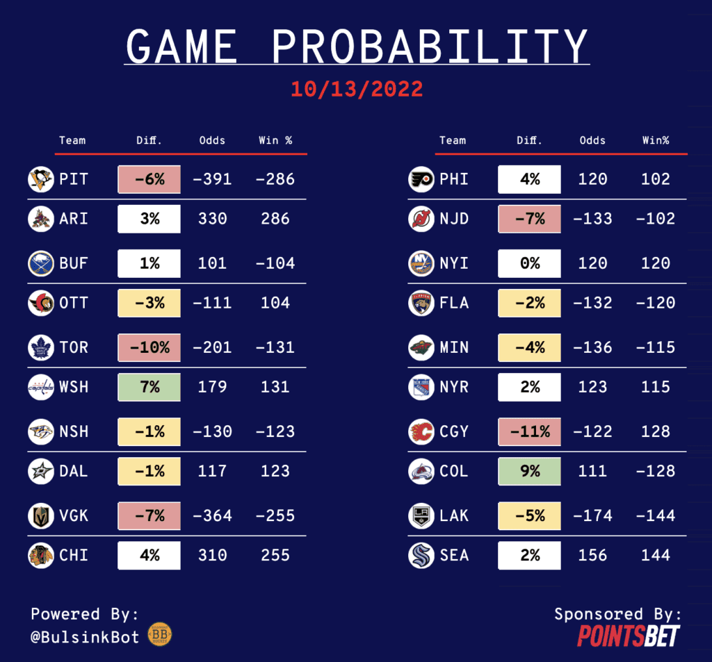 Both teams are coming off ugly losses in their season openers on Wednesday. Washington lost 5-2 vs. Boston, and Toronto dropped their game in Montreal 4-3. As a result, both teams are expected to go with their other goaltending options on Thursday, Charlie Lindgren for the Capitals and former Capital Ilya Samsonov for the Maple Leafs. Despite losing in Montreal, the Maple Leafs are still pretty substantial favourites (-201) on home ice. The model thinks that line should be closer to -130, making the Capitals a valuable bet at +179. If you have concerns about Lindgren, the 28-year-old has a .913 SV% in 29 career NHL appearances and had a .925 SV% in 34 AHL games last year, so he’s a more than capable NHL backup.