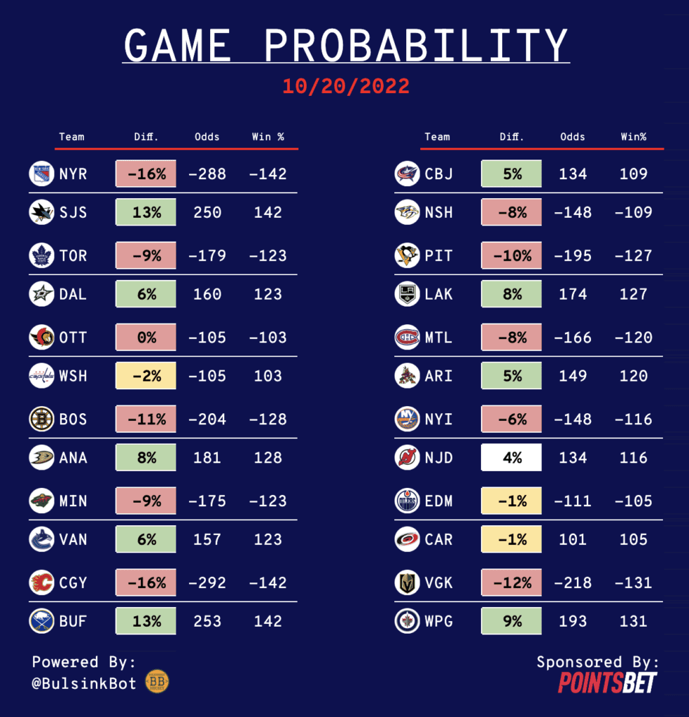 The Sabres are coming off of an impressive win over the Oilers. Eric Comrie stood on his head to earn the win and now they’re in Calgary to take on an undefeated Flames team. It’s a tough spot but the Sabres have looked solid so far and tonight’s line is so far in Calgary’s favour (-292) that the model likes taking a shot on the Sabres. I’m really only interested if Comrie gets the nod though, so keep an eye on our starting goalies page for him to get confirmed.