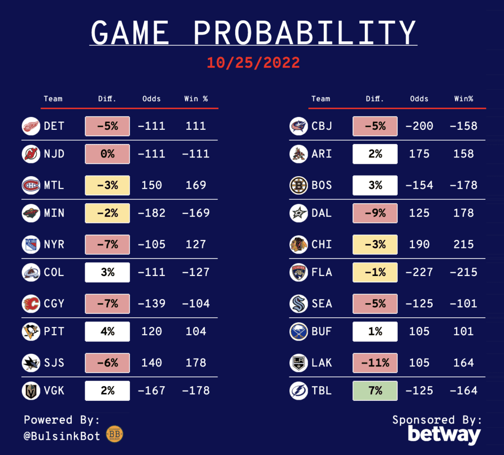 Each day we will look at each game, the Sportsbook Odds (via Betway), and the odds of each team winning based on the model created by Philip Bulsink. Based on those two numbers, we can quickly identify which teams we need to bet on, which teams to avoid and which lines to keep an eye on throughout the day.