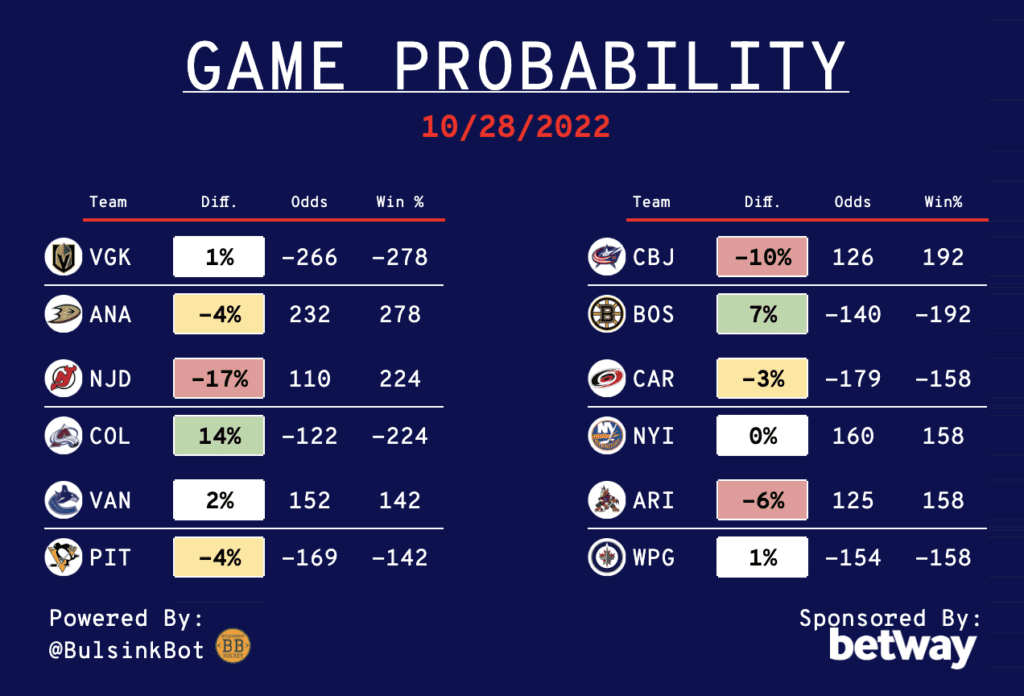 Each day we will look at each game, the Sportsbook Odds (via Betway), and the odds of each team winning based on the model created by Philip Bulsink. Based on those two numbers, we can quickly identify which teams we need to bet on, which teams to avoid and which lines to keep an eye on throughout the day.