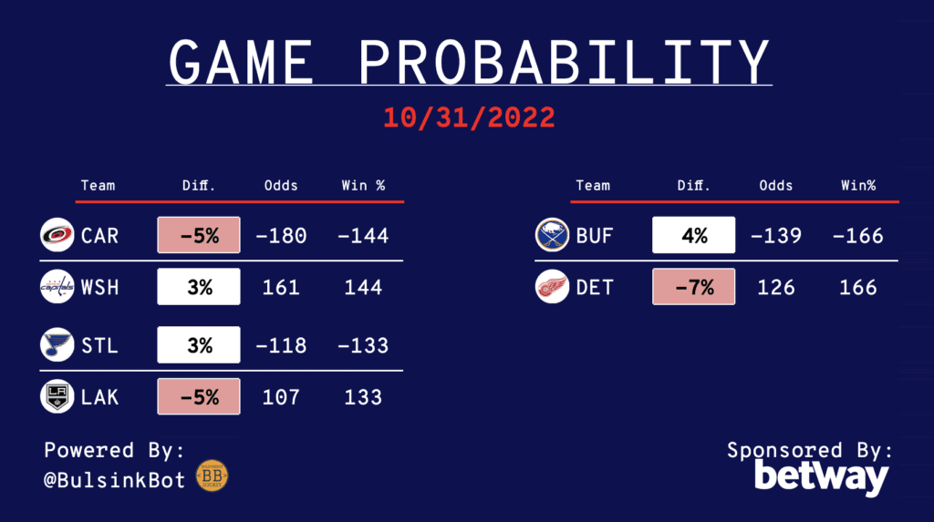 The Sabres and Red Wings have very similar profiles entering Monday’s meeting. Both have 10 points in eight games. Buffalo has been better at 5v5, ranking 19th in xGF% (47.9), and Detroit is at 27th (44.3). Their power-plays are similar, and you have to give the Red Wings the edge on the PK. The Sabres are slight home favourites (-139), but the model sees them at -166. It’s the closest to recommending a bet we’ve got and seems worthy of a small play.