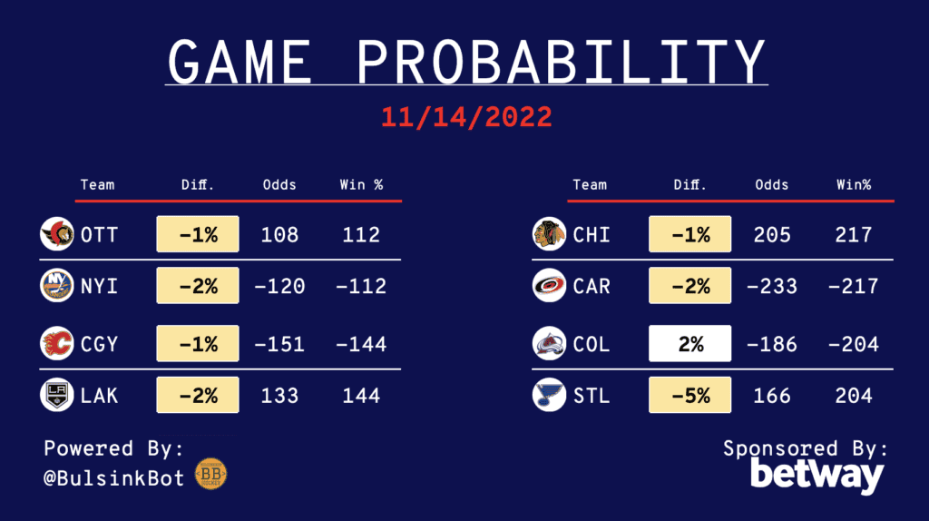 Each day we will look at each game, the Sportsbook Odds (via Betway), and the odds of each team winning based on the model created by Philip Bulsink. Based on those two numbers, we can quickly identify which teams we need to bet on, which teams to avoid and which lines to keep an eye on throughout the day.