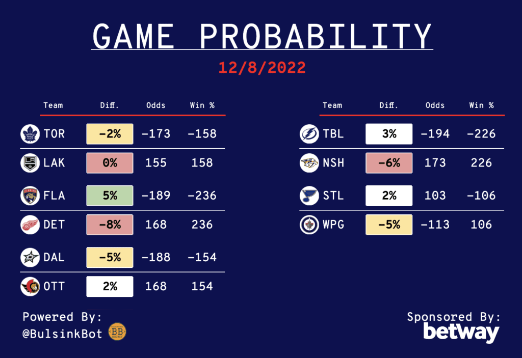 Each day we will look at each game, the Sportsbook Odds (via Betway), and the odds of each team winning based on the model created by Philip Bulsink. Based on those two numbers, we can quickly identify which teams we need to bet on, which teams to avoid and which lines to keep an eye on throughout the day.