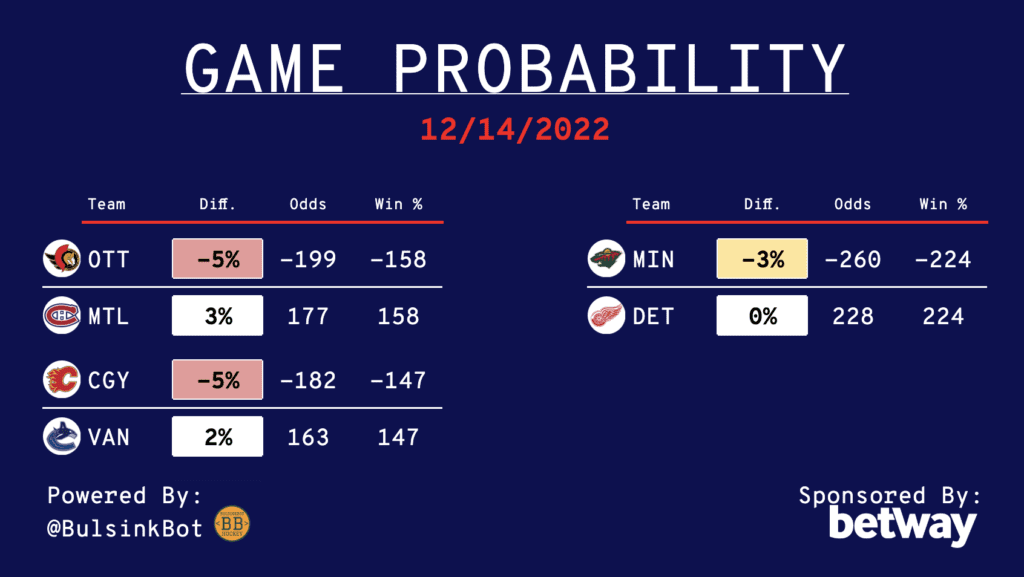 The model would like Montreal if you can find them around +196 and Vancouver around +181, but at their current odds, the model is not recommending any bets tonight.
