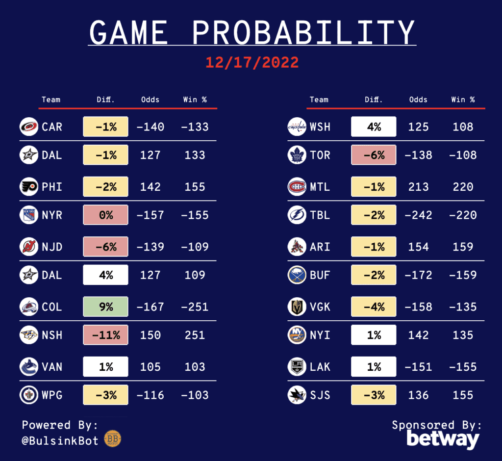 According to the model, the market continues to overvalue the Avalanche injuries. Colorado is at -167, but the model views them as massive -251 favourites. Colorado will shuffle their lines up tonight and look more like the team we saw earlier in the season, missing just Nathan MacKinnon, Bowen Byram, and Josh Manson. If you’re worried about Colorado’s injuries, you should also be worried about the Predators’ blueline, which is still missing Ryan McDonagh, Mark Borowiecki, Alexandre Carrier and Jeremy Lauzon. They’ve lost five in a row and have won just five of their 14 road games this season.