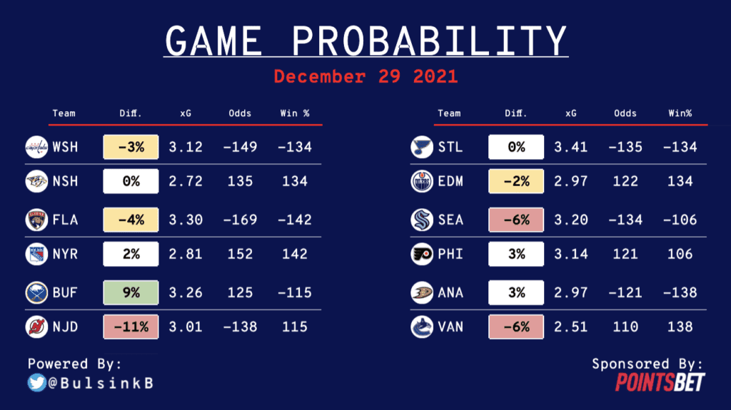 Tonight is a big night for Sabres fans and their should be plenty of excitement in the building. This may not be the exact Sabres team that the model sees but it shouldn’t be any worse. It sees plenty of value on the Sabres as +125 home underdogs.