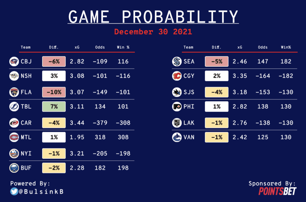 Though the model likes Tampa Bay at +134, it doesn’t see that the Lightning are missing Andrei Vasilevskiy, Anthony Cirelli, Mikhail Sergachev or Erik Cernak. So we’re going to avoid that tonight.