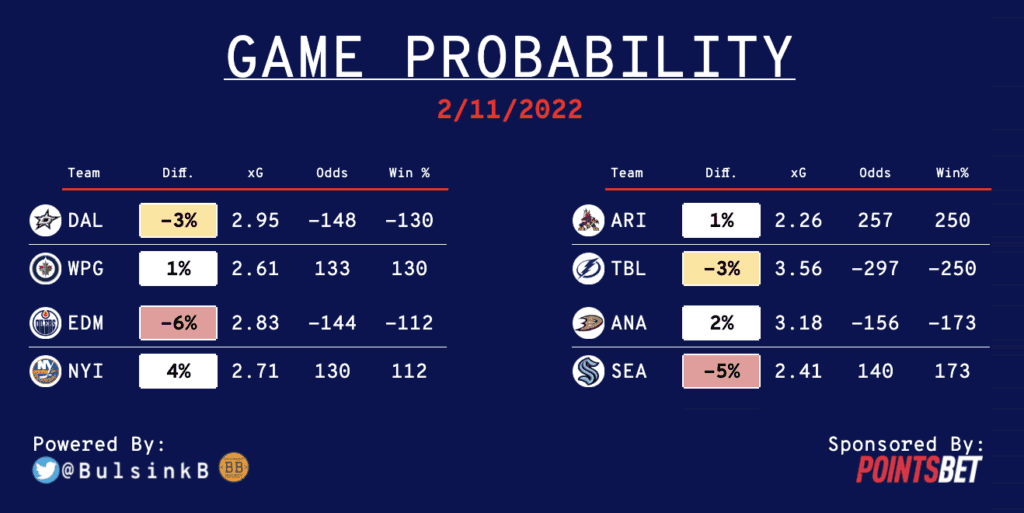 The Oilers are set to play their first game under new head coach Jay Woodcroft and come into the game as -144 favourites. With the model seeing the Oilers as -112 favourites, it sees value on the Islanders at +130. It’s not quite enough to recommend a bet, but if you can find them around +134 then it becomes a 1 unit bet.
