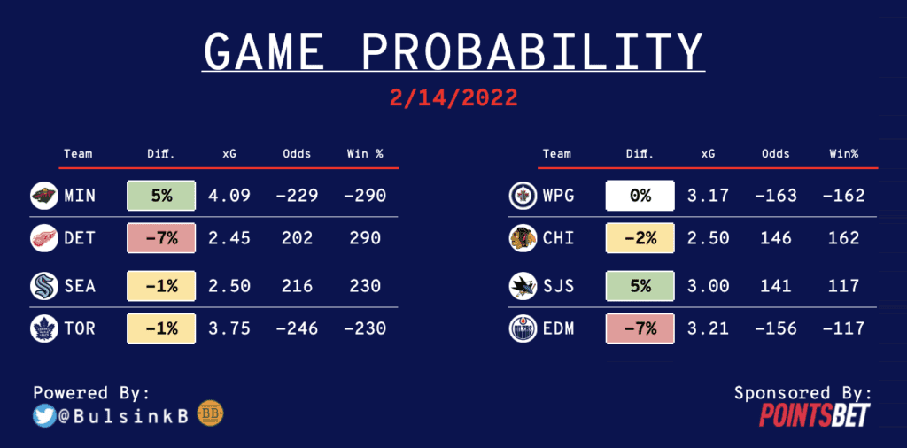 The Wild are massive favourites to start the week but the model still sees enough value on them at -229. The model sees Minnesota as the largest favourites on the slate (-290), giving them a 74.4 percent chance of winning tonight.
