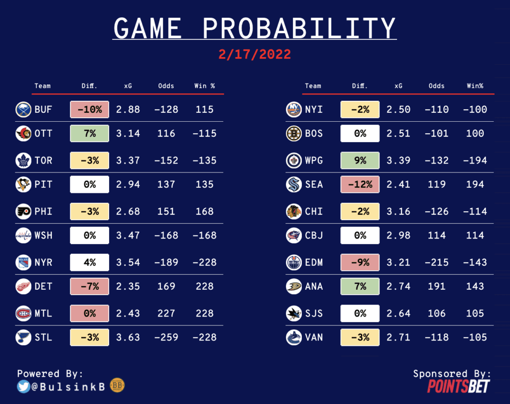 Each day we will look at each game, the Sportsbook Odds (via PointsBet), and the odds of each team winning based on the model created by Philip Bulsink. Based on those two numbers, we can quickly identify which teams we need to bet on, which teams to avoid and which lines to keep an eye on throughout the day.