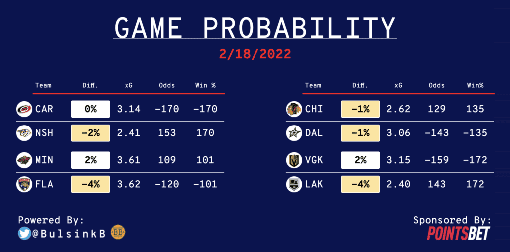 Each day we will look at each game, the Sportsbook Odds (via PointsBet), and the odds of each team winning based on the model created by Philip Bulsink. Based on those two numbers, we can quickly identify which teams we need to bet on, which teams to avoid and which lines to keep an eye on throughout the day.