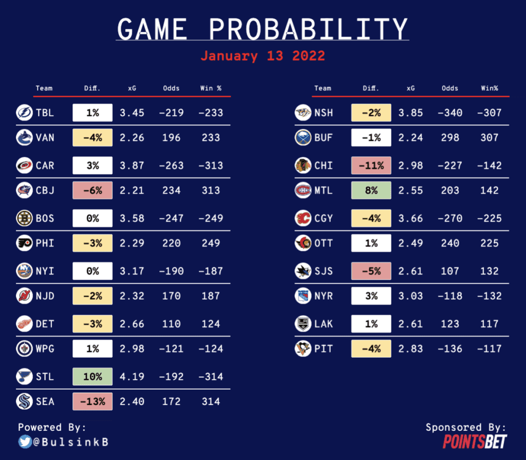 Each day we will look at each game, the Sportsbook Odds (via PointsBet), and the odds of each team winning based on the model created by Philip Bulsink. Based on those two numbers, we can quickly identify which teams we need to bet on, which teams to avoid and which lines to keep an eye on throughout the day.