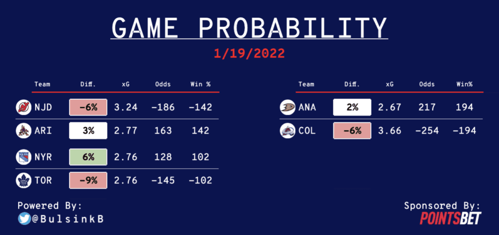 Each day we will look at each game, the Sportsbook Odds (via PointsBet), and the odds of each team winning based on the model created by Philip Bulsink. Based on those two numbers, we can quickly identify which teams we need to bet on, which teams to avoid and which lines to keep an eye on throughout the day.