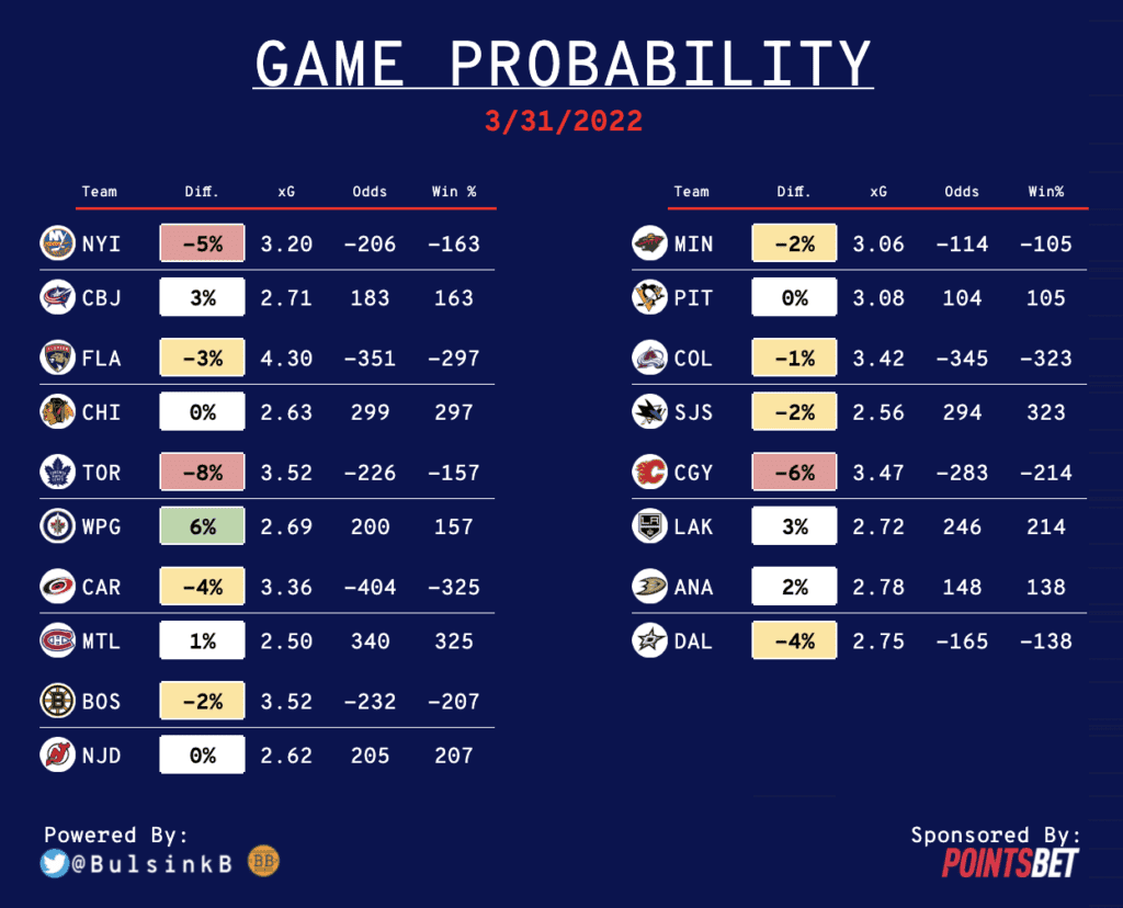 Each day we will look at each game, the Sportsbook Odds (via PointsBet), and the odds of each team winning based on the model created by Philip Bulsink. Based on those two numbers, we can quickly identify which teams we need to bet on, which teams to avoid and which lines to keep an eye on throughout the day.
